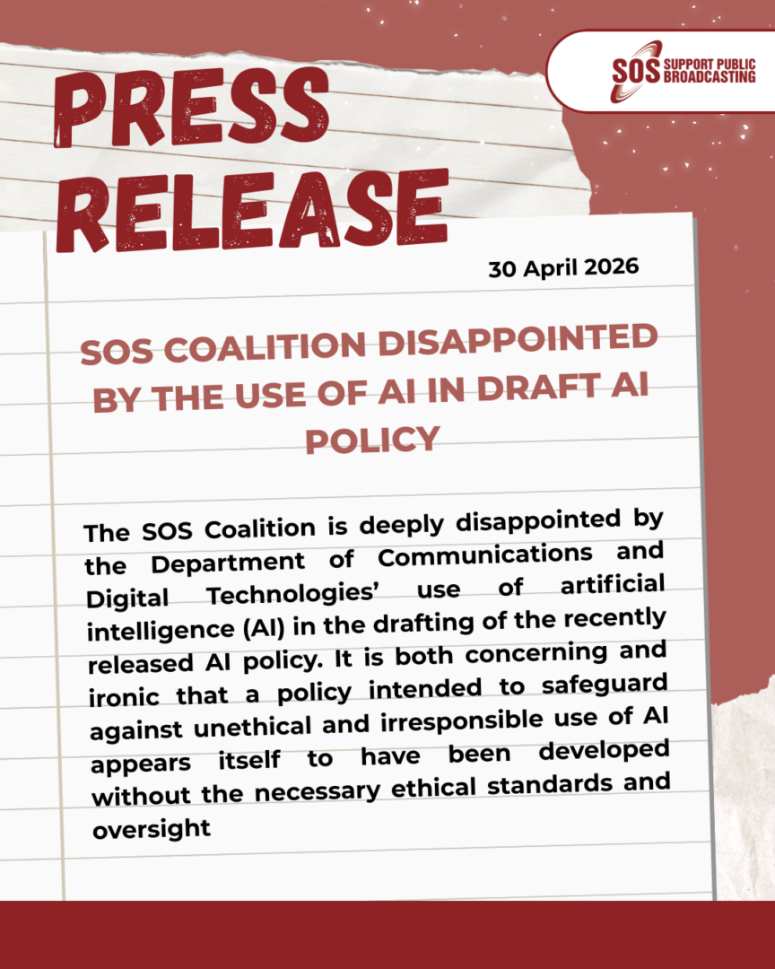 SOS is a non-profit organisation that is at the centre of safeguarding public service media in South Africa. We are committed to and continue to work tirelessly to lobby government and other stakeholders to ensure a strengthened and efficient public